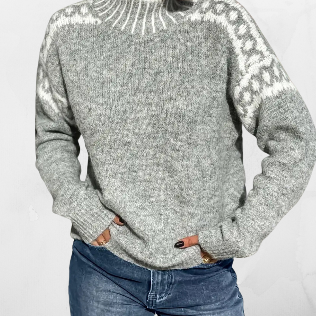 The Ivy | Cozy Knit Sweater is perfect for chilly days. Its soft knit fabric and high neckline keep you comfortably warm, while the subtle Scandinavian-inspired pattern adds a timeless winter touch to your look.